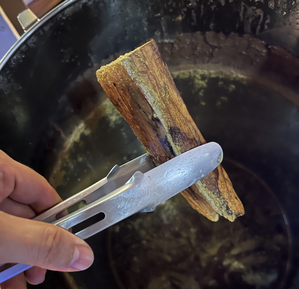 Como mencioné anteriormente, en previas cervezas, el palo santo aportó rápidamente intensos aromas y sabores herbales y mentolados. En esta cerveza tomé muestras diarias para evaluar la extracción de la madera y asegurar el balance de la cerveza. En esta cerveza fueron suficientes tres días para extraer suficiente aroma y sabor de la madera.
